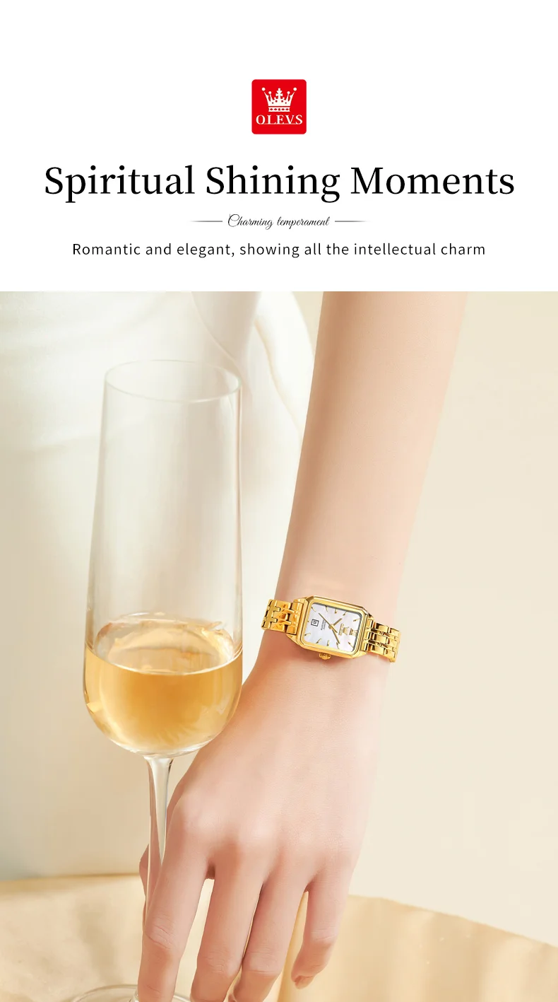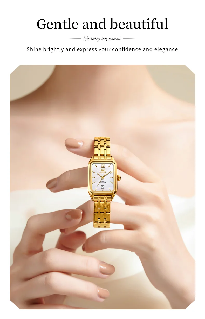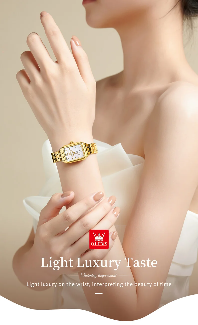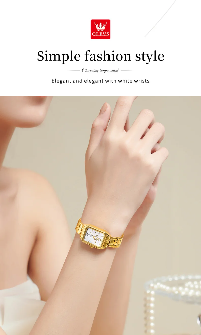 The OLEVS 5616 GoldenSquare watch combines elegance and practicality in a sleek, square stainless steel design. Its numberless dial and delicate needle hands create a minimalist yet sophisticated look, while the coated glass ensures durability and clarity. The folding clasp with safety offers secure wear, making it perfect for everyday use or special occasions.