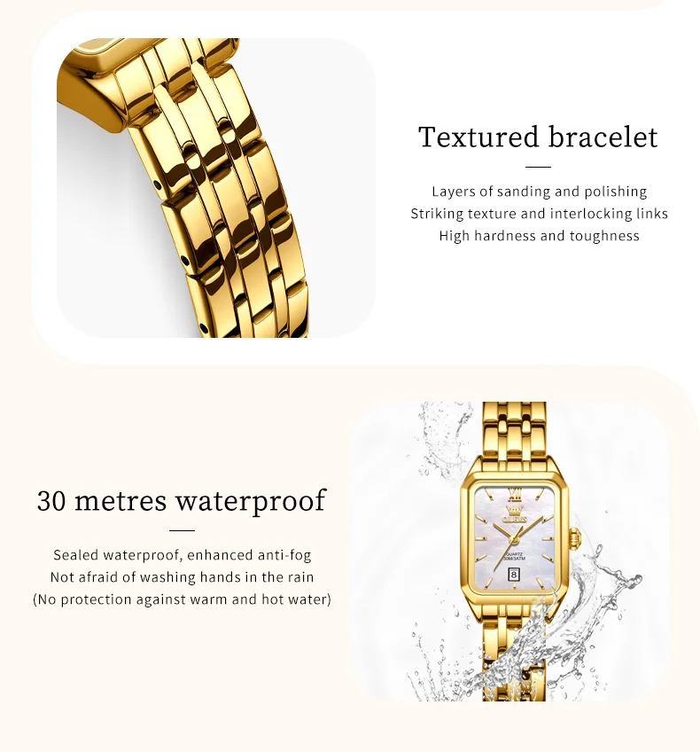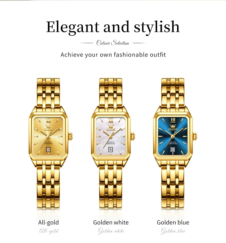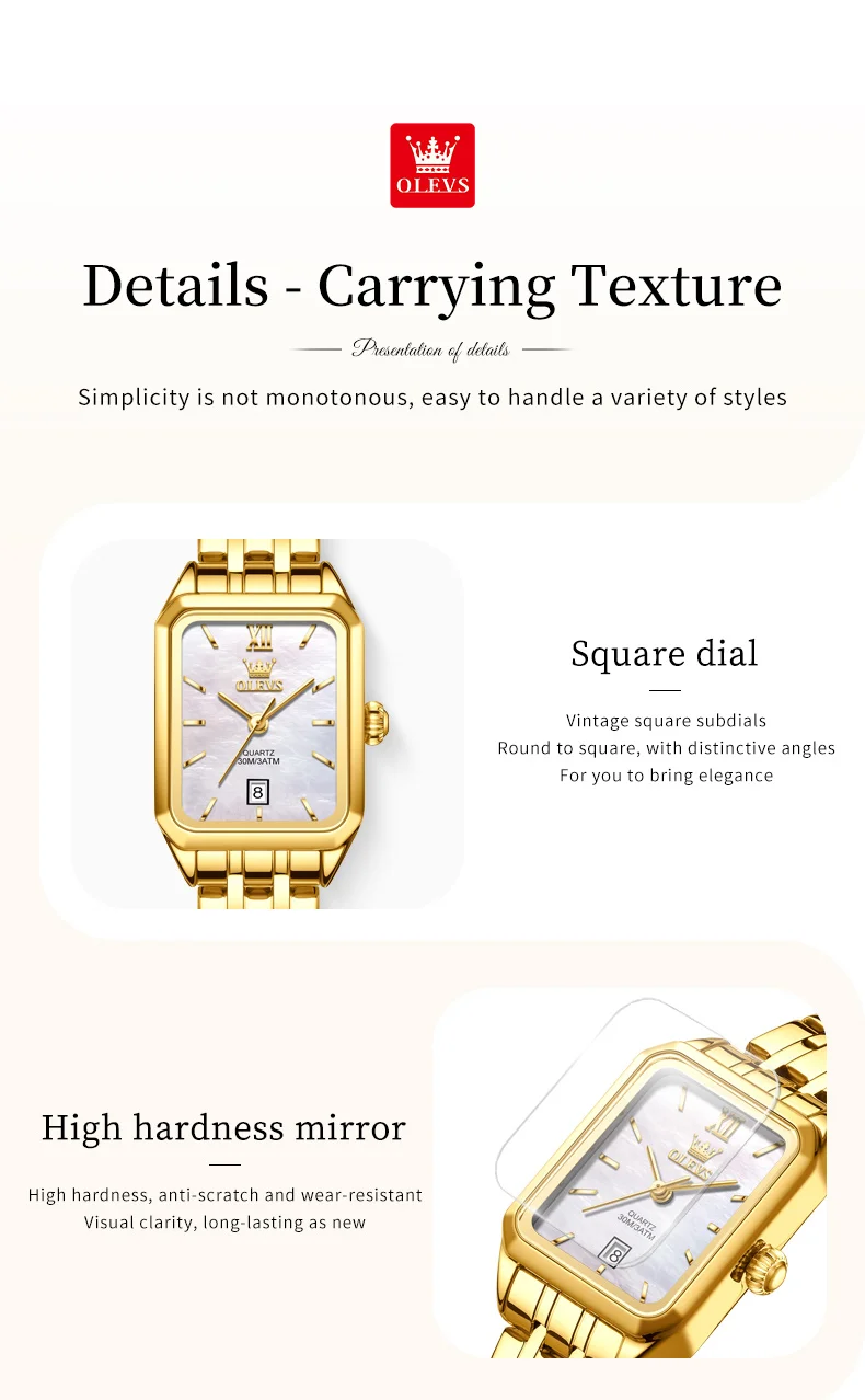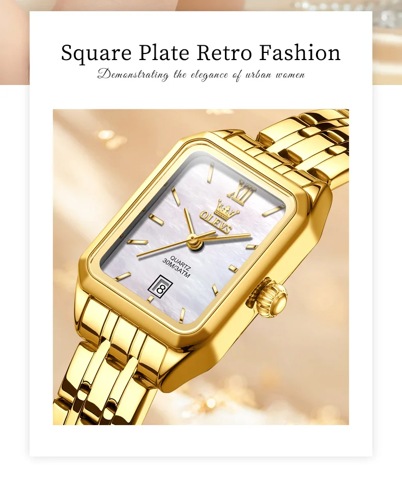 The OLEVS 5616 GoldenSquare watch combines elegance and practicality in a sleek, square stainless steel design. Its numberless dial and delicate needle hands create a minimalist yet sophisticated look, while the coated glass ensures durability and clarity. The folding clasp with safety offers secure wear, making it perfect for everyday use or special occasions.