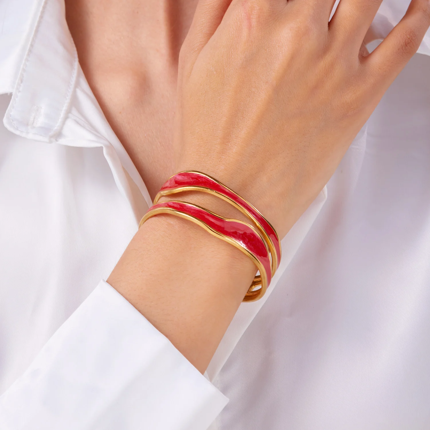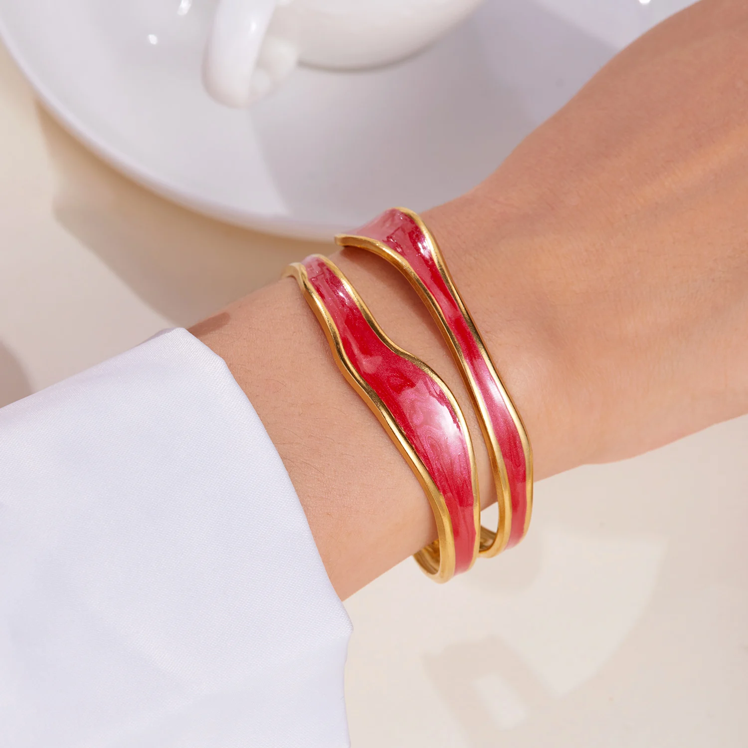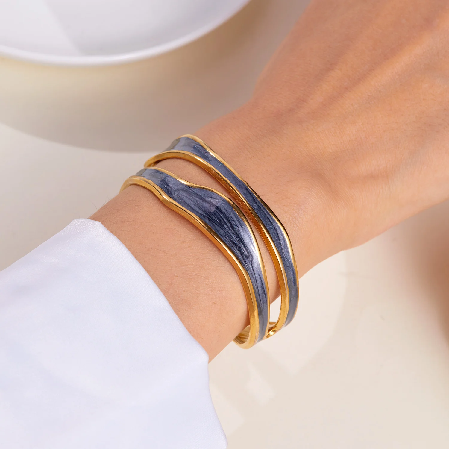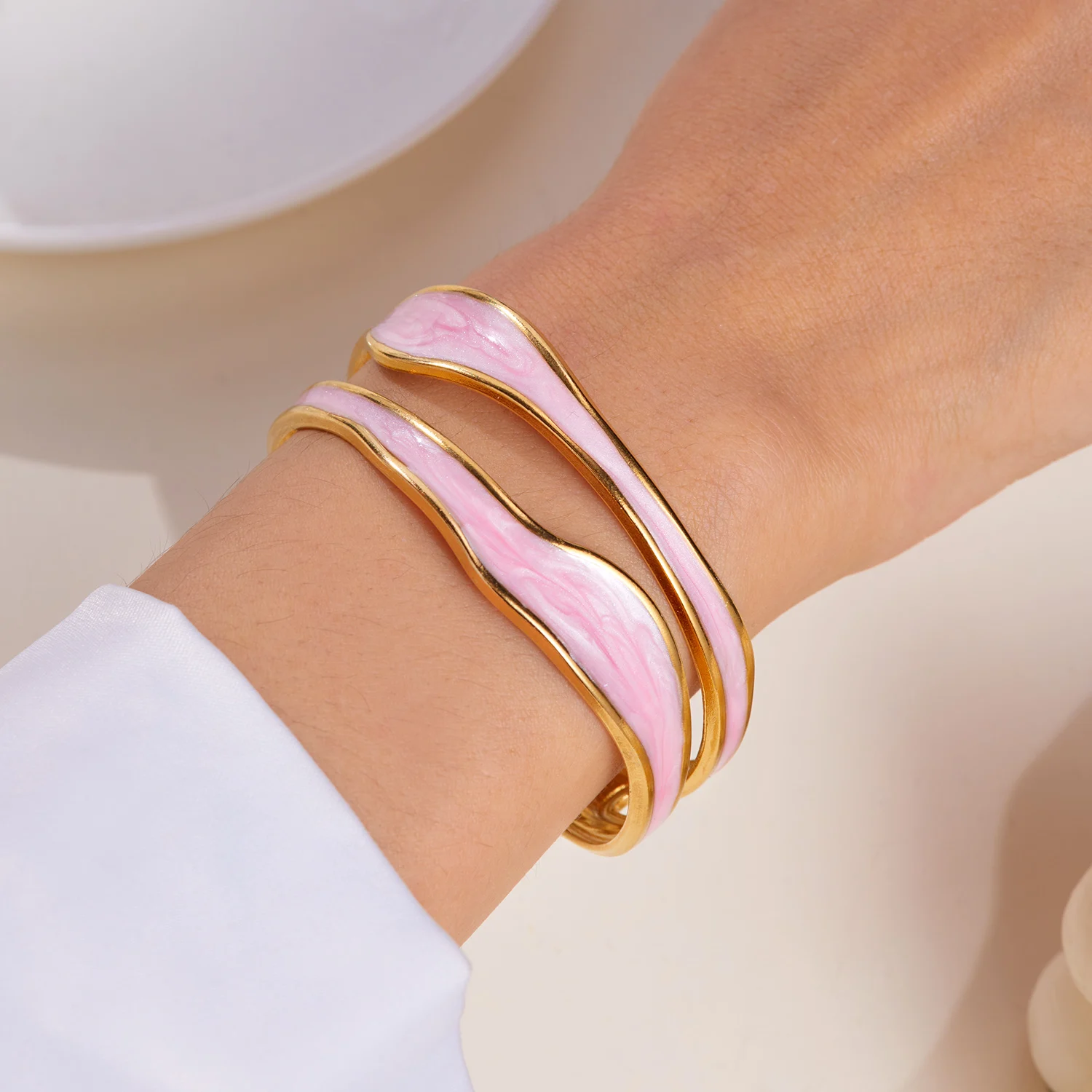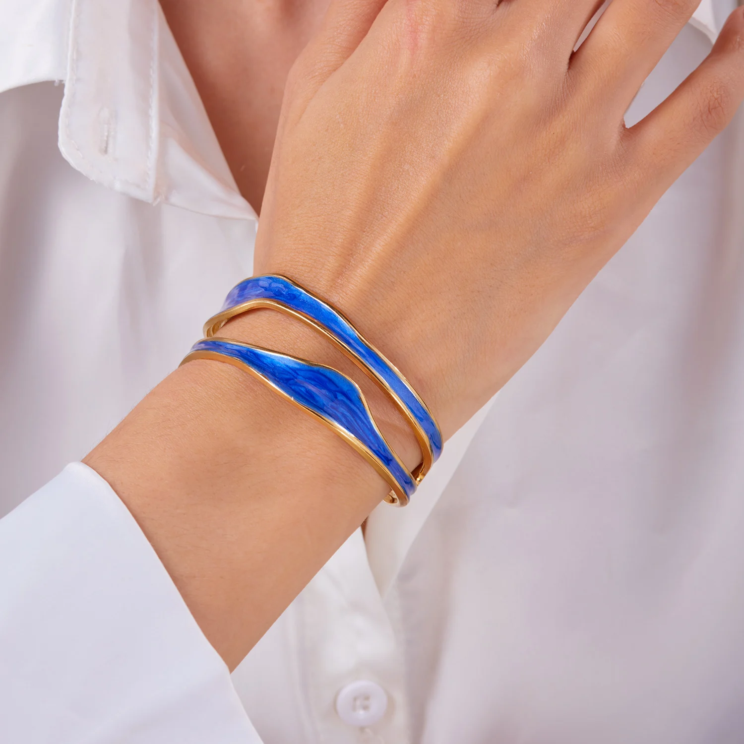 The Ivory Arc Bracelet is a chic and minimalist accessory that effortlessly combines elegance with modern design. Crafted from durable stainless steel and finished with a pristine white enamel coating, its irregular geometric shape adds a unique, contemporary flair. The open cuff design ensures a comfortable fit while showcasing a sophisticated silhouette.
